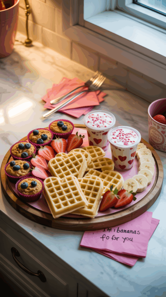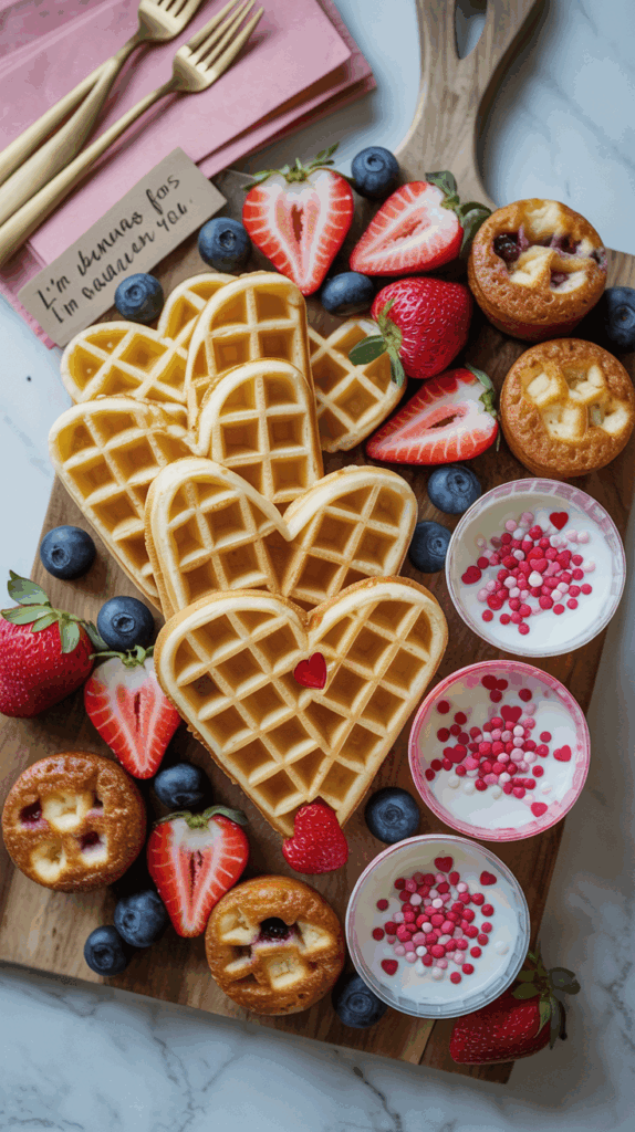 If you’ve ever made a charcuterie board, think of this as the breakfast version—only cuter. Use a large platter or cutting board and fill it with a mix of sweet and healthy bites: heart-shaped waffles, cut fruit, mini muffins, yogurt parfait cups, and maybe a few chocolate-dipped strawberries for flair. Add Valentine sprinkles on everything and tuck in some cute napkins or tiny forks for the kids. It looks super impressive but takes less than 20 minutes if you use store-bought elements. I usually do this when we have cousins staying over or when I want to avoid cooking but still make it feel special. Let the kids pick their favorite items from the board—it makes breakfast feel like an event. You can even include little love notes next to certain items, like “I’m bananas for you” by the bananas. It’s playful, customizable, and guaranteed to be a hit. Honestly, adults love it too.