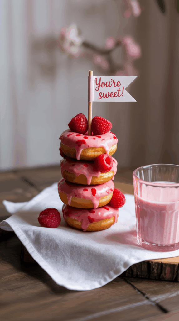 No time to bake? Grab a pack of mini donuts—plain or strawberry glazed work great—and stack three of them on a skewer with strawberries or raspberries in between. Top with a tiny paper flag that says “Donut go breaking my heart” or “You’re sweet!” and boom, you’ve got a Valentine’s breakfast treat that looks bakery-level adorable. Add some pink ribbon or even glittery washi tape if you want to go full-on Pinterest. The combo of donut + fruit makes it feel slightly balanced (okay, not really, but it looks cute). I made these for our neighbor’s kids once, and they still ask about them every February. Serve with a glass of strawberry milk or a pink smoothie and you’ve got a 10-minute win. Just be sure to make extras—these go fast.