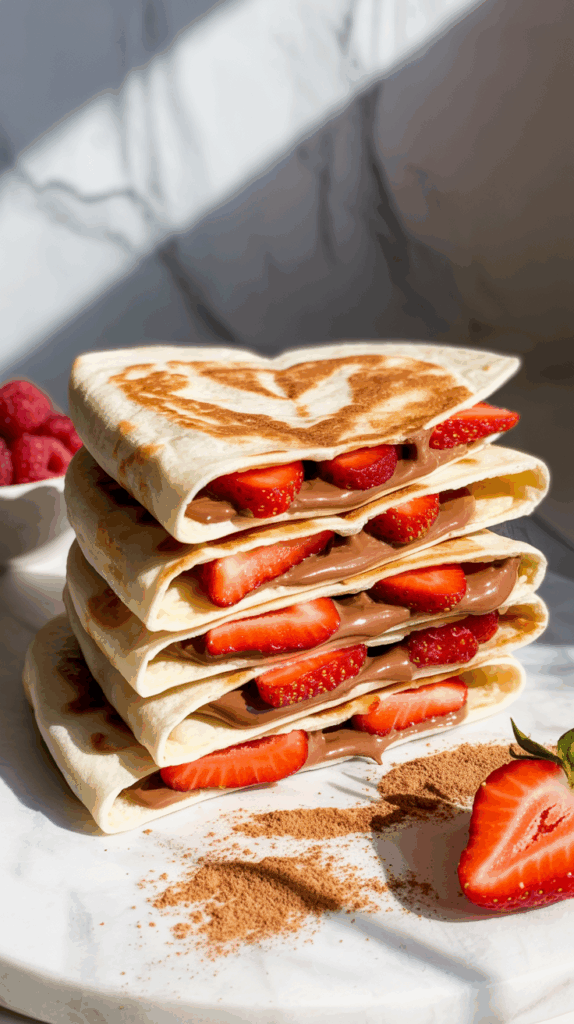 Take two flour tortillas, spread one with Nutella or peanut butter, and add a layer of sliced strawberries or bananas. Press the second tortilla on top and use a large heart-shaped cookie cutter to stamp out quesadillas before lightly toasting in a pan. When you cut into them, the filling oozes out just a little—like a chocolate love letter. These are so easy and always a hit. If you’re dairy-free, swap in sunbutter or almond butter and skip the Nutella. Dust the finished hearts with cinnamon sugar or leave them plain for a healthier vibe. My kids once called these “flat donuts,” which… honestly isn’t wrong. Serve with a side of yogurt or berries and you’ve got a cozy, melty, gooey Valentine’s Day breakfast that’s a total keeper.